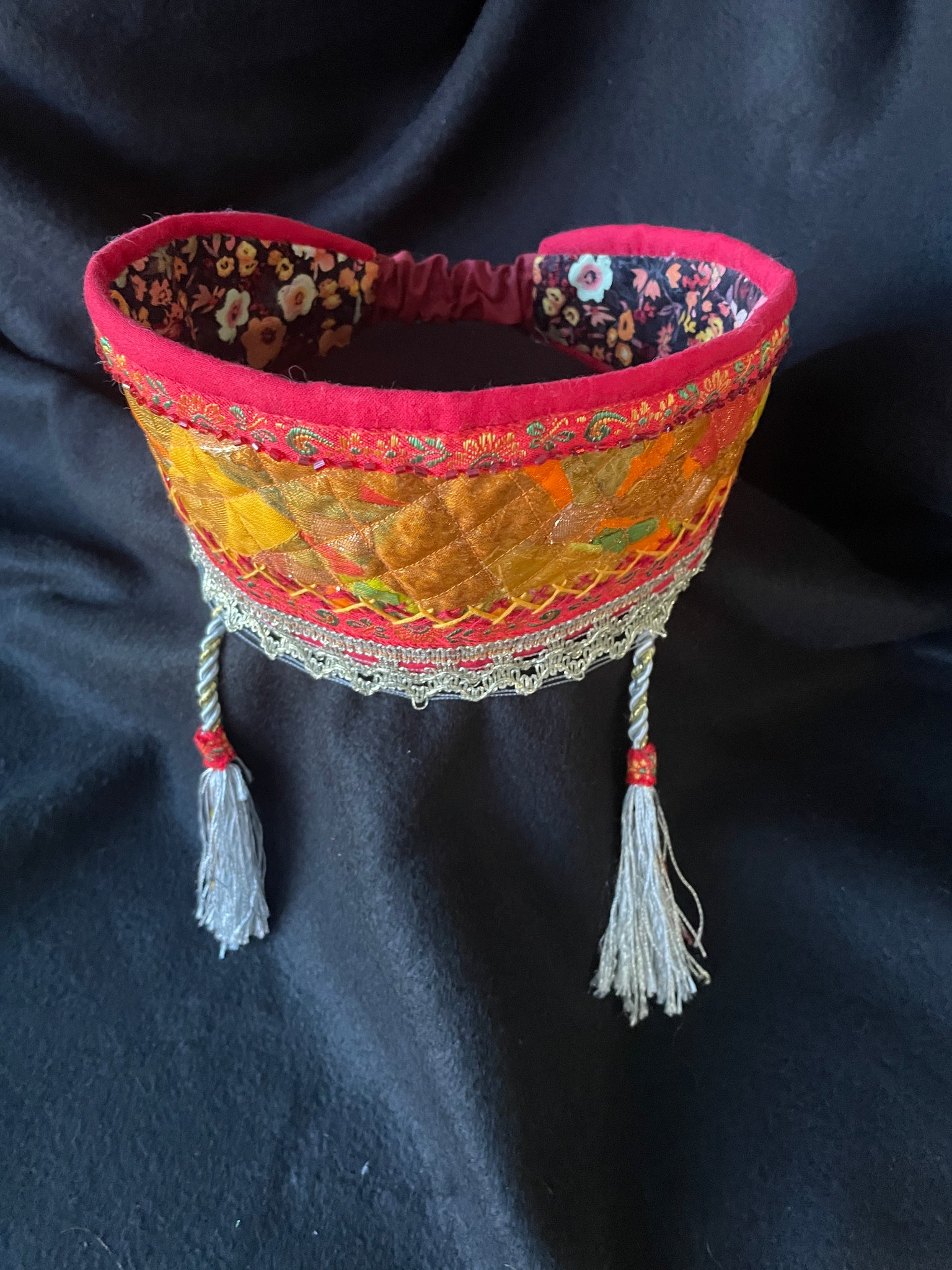 This red headpiece is decorated with rows of colored braids in ethnic Slavic style, goldish lace-kind braids. Red beads line adds more sparkling.