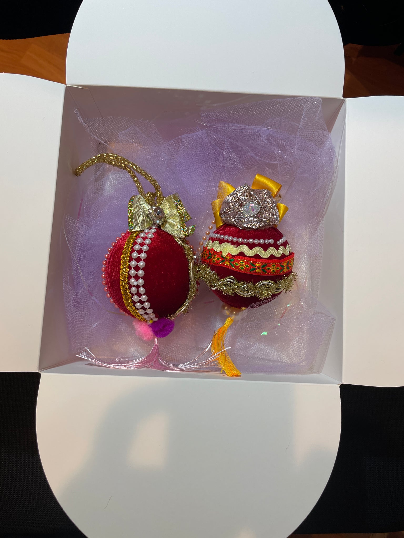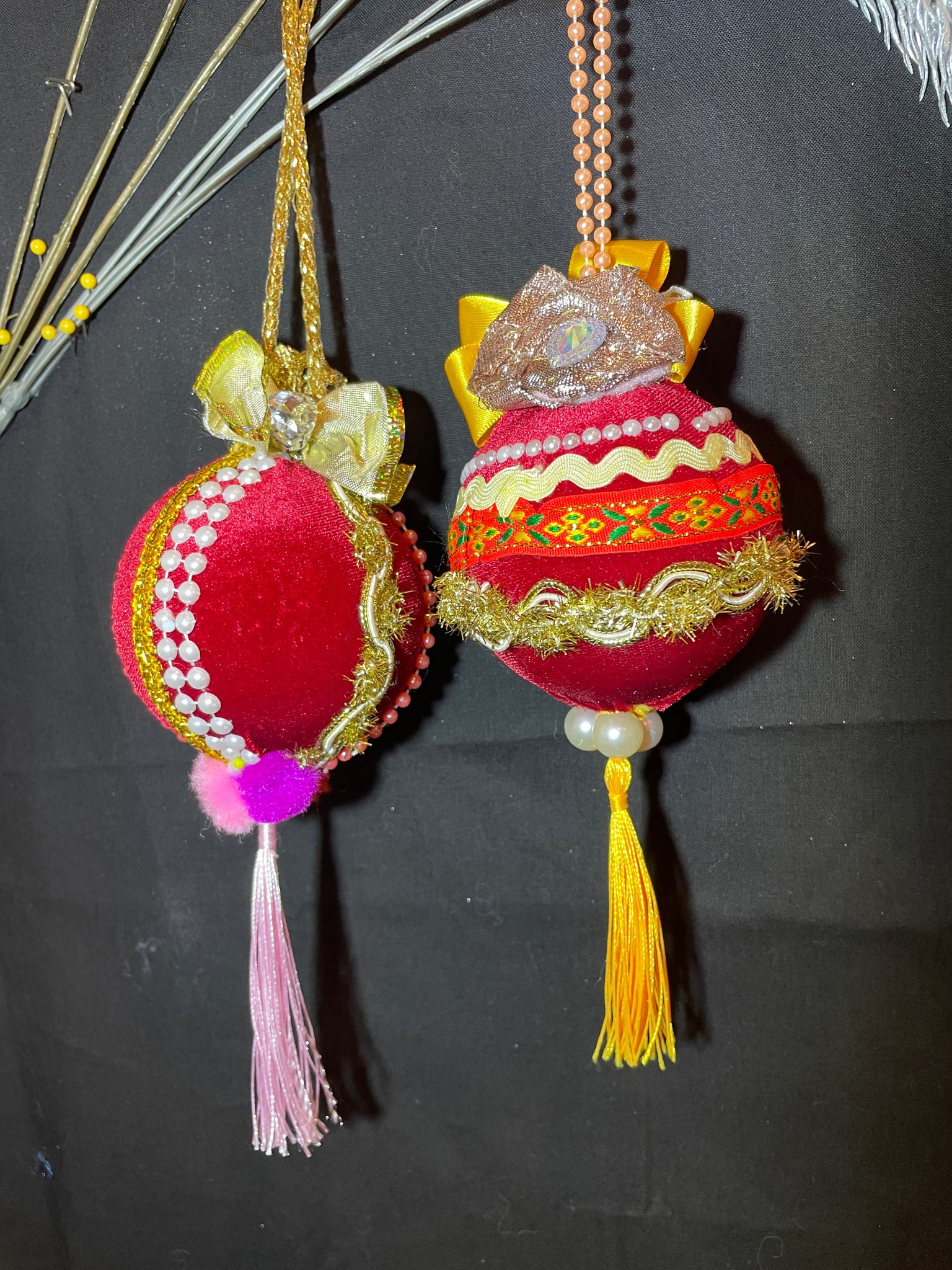 Christmas tree velvet sphere ornaments, set of 2 balls, handmade by Anna Razgulova (koshmariki.org)